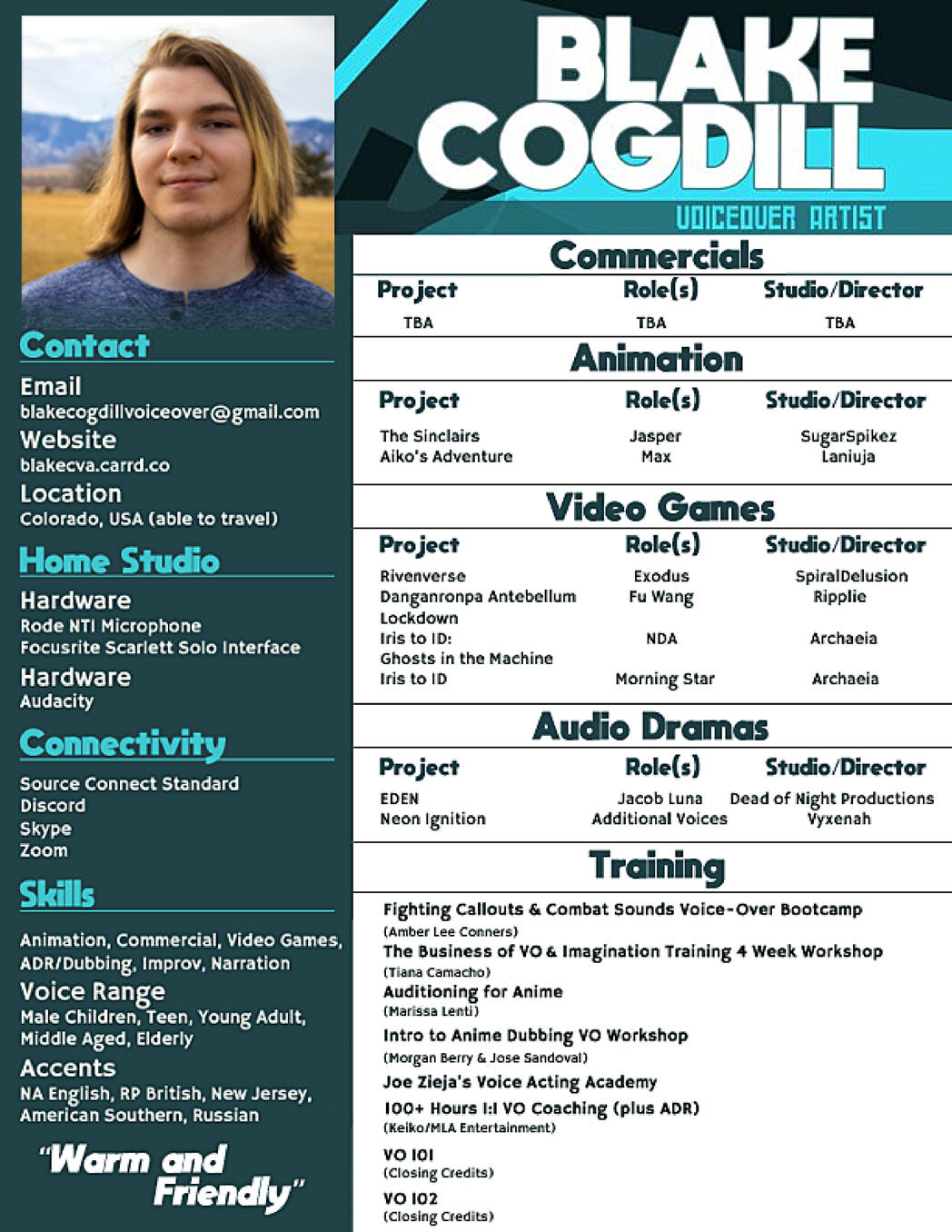 Blake Cogdill is a dedicated Non-Union Voiceover Artist based in Colorado. With nearly seven years of experience, Blake has the skills and voice for your project be it animation, video games, commercials, anime, and more.